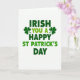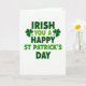 This card features a crisp white background with the greeting “IRISH YOU A HAPPY ST PATRICK’S DAY” centered in large, uppercase letters. Most of the words appear in deep emerald green, giving the message a steady, classic look. The smaller phrase “YOU A” switches to a lighter lime green, like a friendly nudge between close friends sharing an inside joke 💚. Two dark green shamrocks sit on either side of “YOU A,” like little companions leaning in to frame the wordplay ☘️. The layout stays open and uncluttered, with plenty of white space around the text so the greens stand out. The text is arranged in stacked lines, with “IRISH YOU A” above and “HAPPY ST PATRICK’S DAY” below, all aligned to feel balanced and easy to read. The shamrocks have simple leaf shapes in the same darker green as the main lettering, positioned as small accents near the middle of the design.