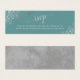 Esta tarjeta en miniatura es perfecta para añadir una dirección web rsvp en línea a sus invitaciones de boda. Presenta un elegante diseño de color verde azulado o turquesa con rizos de Relieve metalizado gris plateado y remolinos y caligrafía de escritura RSVP. Hay espacio para la url de tu sitio web y un plazo de respuesta. El fondo es de un bonito color gris de mármol.