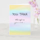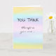 ¡Celebra un logro profesional importante de tu colega, amigo o ser querido con esta tarjeta! El mensaje es un juego de palabras con la frase del filósofo René Descartes "Je pense, donc je suis [creo, por lo tanto yo soy]" ("cogito ergo sum"). La parte delantera de la tarjeta dice: "USTEDES PIENSAN", seguido de "por lo tanto ustedes son..." Al abrir la tarjeta, la redacción continúa: "¡TENURADO! ¡Felicitaciones!" La parte delantera de la tarjeta tiene un efecto de lavado en color agua pastel en amarillo, azul claro, rosa y violeta pálido. ¡Perfecto para cualquier persona al obtener un puesto académico!