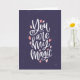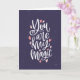 Tarjeta púrpura con fondo de estrellas con una fuente elegante que dice "Eres mi magia" con corazones rosados pequeños. La estrofa interior dice "Llenas mi corazón de magia y destellos cada vez que me tocas. Llenas mi alma de felicidad y alegría. ¡Feliz día de San Valentín"!
