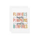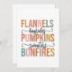 Este diseño colorido y divertido del otoño presenta una lista de favoritos del otoño, incluyendo "Camisetas de franela", "Paseos en carreta de heno", "Calabazas", "Suéteres" y "Fogatas". El texto se presenta en una fuente negrita y mayúscula con cada palabra llena de un cálido y terroso tono diferente, que van desde rosas y naranjas suaves hasta verdes y azules apagados, capturando perfectamente el espíritu acogedor y vibrante de la temporada. Las palabras "paseos en carreta de heno" y "suéteres" están escritas en una escritura fluida, lo que añade un toque de elegancia y crea un buen contraste con las letras mayúsculas en negrita. Los florituras decorativas enmarcan el texto en escritura, lo que añade al encanto y atractivo general. Este diseño es perfecto para el otoño.