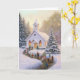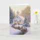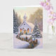 Tarjeta de muy bonitos con escena de nieve y iglesia con feligreses