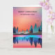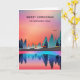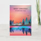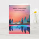 Tarjeta de Navidad con un hermoso diseño gráfico que presenta un lago tranquilo con ciervos. y altos pinos reflejados en el agua. Las estrellas flotan en lo alto.