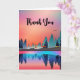 Gracias tarjeta con un hermoso diseño gráfico con un tranquilo lago con ciervos. y altos pinos reflejados en el agua. Las estrellas se ciernen sobre sus cabezas.