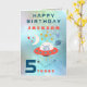 Envíe los deseos de cumpleaños de un fan espacial de 5 años con este divertido diseño de una nave espacial con un lindo alien dentro con luna y estrellas en un fondo de color agua en tonos verde azulados, azules y verdes. Personalice fácilmente el texto según sus propias necesidades.