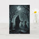 Un espectro negro se para sobre una lápida, en un cementerio bajo una luna llena, en esta tarjeta espeluznante y espantosa de Halloween.