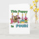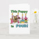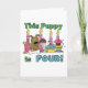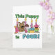 Camisetas de cuarto cumpleaños, trajes para el cuerpo, imanes, tarjetas, bolsos de té, botones de cuarto cumpleaños, y más con velas de cumpleaños, un adorable cachorro marrón, un gorra fiesta y muchos dulces de cumpleaños. El texto dice "¡Este cachorro es 4!".