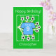 ¡Envíe saludos de cumpleaños a su estrella de fútbol! Una tarjeta de cumpleaños totalmente personalizable con temas de fútbol/fútbol con una camiseta de fútbol azul aky en los colores de la Ciudad de Manchester, sobre un campo con balones de fútbol siendo pateados para disparar en todas direcciones, con estrellas doradas. Personalice el saludo de cumpleaños; el número escrito que podría sustituirse por un apodo; el número que aquí representa una edad, así como el nombre que podría adaptarse al nombre de un club de fútbol favorito. ¡Brillante, alegre, positiva diversión futbolística para los hinchas futbolísticos / deportivos!