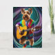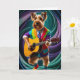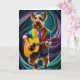 Un Terrier Escocés con traje colorido toca guitarra acústica.