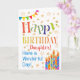 Una colorida tarjeta de cumpleaños para una hija basada en texto, con Bunting Polka Dot, velas de torta de cumpleaños brillantes y rayadas y salpicadas con estrellas de efecto oro. El texto con estampado dice, 'Feliz cumpleaños' y también hay '¡Que un día maravilloso!' con letras azules (Nota: las estrellas y contornos del efecto oro serán como se ven y no se imprimirán con tinta metálica).