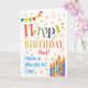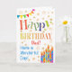 Una colorida tarjeta de cumpleaños para papá basada en texto, con Bunting Polka Dot, velas de torta de cumpleaños brillantes y rayadas y salpicadas con estrellas de efecto oro. El texto con estampado dice, 'Feliz cumpleaños' y también hay '¡Que un día maravilloso!' con letras azules (Nota: las estrellas y contornos del efecto oro serán como se ven y no se imprimirán con tinta metálica).