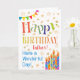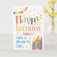Una colorida tarjeta de cumpleaños para un padre basada en texto, con Bunting Polka Dot, velas de torta de cumpleaños brillantes y rayadas y salpicadas con estrellas de efecto oro. El texto con estampado dice, 'Feliz cumpleaños' y también hay '¡Que un día maravilloso!' con letras azules (Nota: las estrellas y contornos del efecto oro serán como se ven y no se imprimirán con tinta metálica).