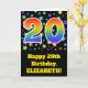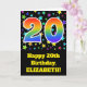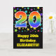 El frente de este emocionante, divertido y vibrante diseño de tarjetas de felicitación de cumpleaños presenta un patrón de coloridas formas estrella, junto con el número "20" que tiene un patrón multicolor de gradiente de espectro inspirado en el arcoiris, sobre un fondo de color negro. La parte delantera también incluye un mensaje de bienvenida de cumpleaños, incluido un nombre de destinatario personalizado. El interior presenta un mensaje de bienvenida de cumpleaños de personalizable, o tal vez podría ser borrado y dejado en blanco si se va a escribir un mensaje a mano. Una tarjeta de cumpleaños personalizada como esta podría ser una manera divertida de enviar un mensaje para celebrar el vigésimo cumpleaños de alguien. [~Z0000348]
