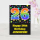 El frente de este emocionante, divertido y vibrante diseño de tarjetas de felicitación de cumpleaños presenta un colorido patrón de campo de estrellas, junto con el número "26" que tiene un espectro multicolor de arcoiris como el patrón gradiente, en un fondo de color negro. En la parte delantera también aparece un mensaje de bienvenida de cumpleaños, incluido un nombre de destinatario personalizado. El interior presenta un mensaje de bienvenida de cumpleaños de personalizado, o tal vez podría ser borrado y dejado en blanco si se va a escribir un mensaje a mano. Una tarjeta de cumpleaños personalizada como esta podría ser una manera divertida de enviar un mensaje para celebrar el 26º cumpleaños de alguien. [~Z0000348]