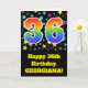 El frente de este emocionante, divertido y vibrante diseño de tarjetas de felicitación de cumpleaños presenta un colorido patrón de estrellas, junto con el número "36" que presenta un espectro multicolor de arcoiris como el patrón gradiente, en un fondo de color negro. La parte delantera también incluye un mensaje de bienvenida de cumpleaños, incluido un nombre de destinatario personalizado. El interior presenta un mensaje de bienvenida de cumpleaños personalizado, o tal vez podría ser borrado y dejado en blanco si se va a escribir un mensaje a mano. Una tarjeta de cumpleaños personalizada como esta podría ser una manera divertida de enviar un mensaje en celebración de los 36 años de alguien. [~Z0000348]