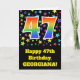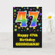 El frente de este emocionante, divertido y vibrante diseño de tarjetas de felicitación de cumpleaños cuenta con muchas formas de estrellas coloridas, junto con el número "47", que presenta un patrón multicolor de gradiente de espectro inspirado en el arcoiris, sobre un fondo de color negro. La parte delantera también incluye un mensaje de bienvenida de cumpleaños, incluido un nombre de destinatario personalizado. El interior presenta un mensaje de bienvenida de cumpleaños de personalizado, o tal vez podría ser borrado y dejado en blanco si se va a escribir un mensaje a mano. Una tarjeta de personalizable como esta podría ser una manera divertida de mandar deseos de cumpleaños a alguien que esté celebrando su cumpleaños cuarenta y siete. [~Z0000348]
