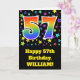 El frente de este emocionante, divertido y vibrante diseño de tarjetas de felicitación de cumpleaños presenta un colorido patrón inspirado en el campo de estrellas, junto con el número "57" que tiene un espectro multicolor de arcoiris como el patrón gradiente, en un fondo de color negro. En la parte delantera también se incluye un mensaje de bienvenida de cumpleaños, incluido un nombre de destinatario personalizado. El interior presenta un mensaje de bienvenida de cumpleaños de personalizable, o tal vez podría ser borrado y dejado en blanco si se va a escribir un mensaje a mano. Una tarjeta de personalizable como esta puede ser una manera divertida de enviar deseos de cumpleaños a alguien que está celebrando su quincuagésimo séptimo cumpleaños. [~Z0000348]