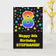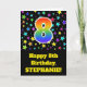 El frente de este emocionante, divertido y vibrante diseño de tarjetas de felicitación de cumpleaños presenta un patrón de coloridas formas estrella, junto con el número "8" que tiene un patrón multicolor de gradiente de espectro inspirado en el arcoiris, sobre un fondo de color negro. En la parte delantera también se incluye un mensaje de bienvenida de cumpleaños, incluido un nombre de destinatario personalizado. El interior presenta un mensaje de bienvenida de cumpleaños personalizado, o tal vez podría ser borrado y dejado en blanco si se va a escribir un mensaje a mano. Una tarjeta de cumpleaños como esta podría ser una manera divertida de enviar deseos de cumpleaños a alguien que esté celebrando su octavo cumpleaños. [~Z0000348]