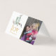 Tarjeta de salutación navideña de temporada de acuarela rústica nevada de pino y abeto con superposición de copos de nieve con purpurina dorada personalizable con tu propia foto.