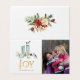 Tarjeta de salutación navideña de temporada de acuarela rústica nevada de pino y abeto con superposición de copos de nieve con brillo dorado personalizable con tu propia foto.