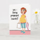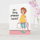 This card features a cheerful, cartoon-style illustration of an expectant mother standing full-body on a white background, her relaxed stance and gentle smile giving the scene a friendly, caring tone 👩. She wears a daffodil-yellow tunic sprinkled with cerise polka dots and matching trim, paired with sky-blue capri pants and simple loafers. A small blue flower rests in her coppery-brown hair, adding a soft, affectionate touch to her upward gaze ❤️. In her left hand, she holds a plain white tote with a warm brown handle, while her right hand lets a bright pink measuring tape drape loosely, suggesting a quiet pushback against being judged by numbers. On the left side of the design, large hand-drawn lettering reads “yes - being pregnant counts!” in dark ink for strong contrast against the white space. The minimal setting keeps attention on her calm expression and the supportive message, with plenty of open space around both figure and text. A thin pink ground line runs near the bottom, giving her a simple place to stand.