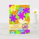 Una tarjeta de aniversario de bodas para regalar a una pareja. Fabulosas flores de 'op art' en colores brillantes. Una tarjeta vibrante que dice '¡FELIZ!'. Las flores multicolores están desparramadas sobre un fondo verde. La tarjeta se deja en blanco para usar como tarjeta de nota o para su propio mensaje. Vea toda la gama de tarjetas en mi tienda. Todos los derechos de autor del arte por Norma Cornes.