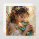 Fairy themed card with a beautiful fairy holding her green and blue dragon. Her hair is adorn in white flowers and she has pretty translucent pearlescent purple wings.