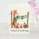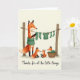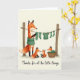 Esta tarjeta muestra una escena acogedora con un personaje adulto parecido a un zorro de pie junto a dos postes de madera rústicos, colgando cuidadosamente ropa verde diminuta a lo largo de una cuerda, como si cuidara del hogar con tranquilidad ❤️. Cerca de sus pies, dos jóvenes más pequeños parecidos a zorros se enfrentan con suaves sonrisas, sosteniendo un calcetín a rayas entre ellos como un secreto compartido entre amigos. Un tercer pequeño descansa en una cesta tejida, observando con una mirada relajada y satisfecha que añade cercanía al momento. El fondo permanece cálido y cremoso, con una luz suave que hace que el pelaje naranja rojizo, los tonos oscuros profundos y las prendas verde bosque se sientan calmados e invitantes. Los detalles finos se muestran en la veta de la madera de los postes, la textura de la cesta tejida y los suaves pliegues de la ropa en miniatura, dando a la imagen un aspecto táctil. A lo largo de la parte inferior, la frase “todas las pequeñas cosas” se sienta centrada en letras oscuras, fácil de leer contra el fondo claro 🌼