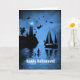 Una tarjeta de Halloween con temática náutica. Brujas y cuervos, sirenas y jinetes sin cabeza, con velero y faro. ¡Añade un par de piedras en la cabeza, gatos negros y un búho! Una tarjeta costera muy divertida, oceánica, de tipo balneario de Halloween.
