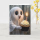 Una figura fantasmal se alza en un bosque nublado, con un quequito adornado con una sola vela de cumpleaños iluminada