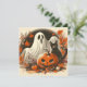 Aquí hay una ilustración de Halloween con aspecto vintage de un fantasma con una jack-o'-lantern y gato negro. Esta tarjeta con aspecto retro muestra al fantasma contra un fondo de hojas en colores otoñales. Es una tarjeta linda con un aspecto retro y es una excelente tarjeta de Halloween y es perfecta para saludos de la temporada espeluznante, invitaciones o para acompañar un regalo.