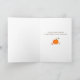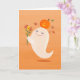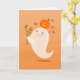 Un bonito fantasma sonríe alegremente mientras flota a través de un fondo naranja oscuro, sosteniendo un ramo de flores caídas como una embustera linterna de jack-o' sobre la cabeza del fantasma. Ilustracion original de Noël Snow.