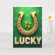 This card features a polished golden horseshoe centered on a deep emerald green background, setting a cozy St. Patrick’s Day scene with a touch of romance and friendship 💚. Nestled inside the horseshoe, a four-leaf clover opens like a small gift, with each leaf shifting through soft green shades that feel fresh and inviting ☘️. The horseshoe’s curved edges catch the light in a way that suggests a gentle, protective embrace around the clover. Behind it all, the green backdrop has a subtle pattern of lighter shamrocks, giving the surface a textured look without stealing attention from the main image. Along the top curve of the horseshoe, the text “ST. PATRICK’S DAY” appears in raised gold letters that follow the arc neatly. Beneath the horseshoe, “LUCKY” sits centered in matching gold, slightly dimensional, and easy to spot at a glance. Soft lighting creates mild shadows around the horseshoe and clover, while the background shamrocks remain faint and evenly spaced across the green field.