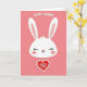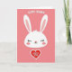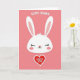 This greeting card features a tall, vertical layout on a soft pink background that sets a gentle, friendly tone 🌷. Centered near the top is a simple white bunny head with long ears, closed eyes with tiny lashes, and a small red heart-shaped nose that hints at a sweet crush 🐰. Light rosy circles on the cheeks add a bashful look, as if the bunny is smiling quietly at someone it cares about. Above the bunny’s ears, the phrase “SOME BUNNY” sits in white, placed neatly so it feels like it’s floating in the open space. Below the face, a large red heart with a thin white outline anchors the design and draws the eye downward. Inside the heart, the words “LOVES YOU” appear in white, centered and easy to read against the red. Soft shadows around the white bunny shape give it a lightly layered look against the pink field, and the red heart sits just beneath the chin with crisp edges and a bright white border.