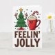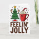 El árbol, adornado con una estrella dorada y zapatos rojos, irradia alegría con un signo de paz 🌟 La taza, coronada con crema batida y un bastón de caramelo, se une a la diversión con su propio signo de paz 🍬 Rodeada de estrellas negras en un fondo blanco, la tarjeta sale de vacaciones. Las palabras "FEELIN' JOLLY" en el afligido tipo de letra marrón y rojo añaden un toque de asombrosa ✨ ¡Difundan un poco de alegría con esta tarjeta perfecta para hacer brillantes los espíritus! 🎅 🏼 🎁