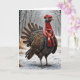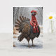 Pavo con bufanda roja en copos de nieve y bosque invernal para felicitaciones por dejar de fumar.