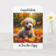 El perro cachorro de caramelo de Apricot jugando en otoño amarillo deja una carta de saludo. Felicidades por tu nuevo cachorro.