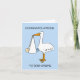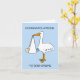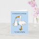 Un personalizado de un bebé retenido en una sábana que cuelga del pico de una cigüeña. La imagen está puesta sobre un fondo azul y acompañada de las palabras 'Felicitaciones a ambas madres'.