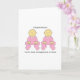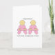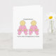 Niñas gemelas con trajes rosados y las palabras "Felicitaciones por ser abuelos a mellizos".