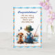 ¡Felicitaciones a tu recién nacido! Un adorable ilustracion dulce de acuarela de un bebé pescando con un cachorro. Los colores de esta tarjeta son azul y naranja.