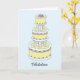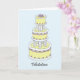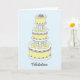 Una torta de varios pisos, rosa, blanca y limón, glaseada, contra un fondo azul pastel. La imagen está acompañada por la palabra 'Felicitaciones'.
