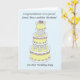 Un pastel de bodas de varios pisos de colores pastel colocado sobre un fondo azul pastel. Las palabras 'Felicitaciones a una sobrina nieta especial y su esposo en su día de boda' acompañan la imagen.