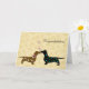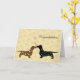 Tarjeta de felicitaciones de boda / compromiso caprichosa hecha en un elegante fondo floral dorado. Una silueta de dachshund marrón y otra negra, con lunares y flores caprichosas pintadas en ellas, se enfrentan, con corazones rosados flotando hacia arriba. Personalice todo el texto, en la parte frontal y en el interior para satisfacer sus necesidades. La tarjeta de felicitaciones perfecta para cualquier amante de los doxie.