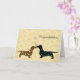 Tarjeta de felicitación de boda / compromiso caprichosa hecha en un elegante fondo floral amarillo dorado. Una silueta de dachshund marrón y otra negra, con lunares y flores caprichosas pintadas en ellas, se enfrentan, con corazones rosados flotando hacia arriba. Personalice todo el texto, en la parte frontal y en el interior para satisfacer sus necesidades. La tarjeta de felicitación perfecta para cualquier amante de los doxie.