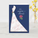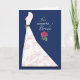 Una flor de peonía rosa se destaca en este fondo azul marino. La flor de peonía también está en el cinturón verde del vestido elegante con espirales en rosa. ¡Felicita y ofrece los mejores deseos a la novia en su despedida de soltera!