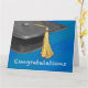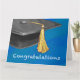 ¡Tú o alguien que conoces se está graduando! ¡Sí! Envía tus felicitaciones con nuestro elegante diseño con nuestro arte original de un gorro de graduación azul con una tassel amarillo contra un fondo negro texturado y la palabra, Felicitaciones en el fondo. Hay diseños personalizados disponibles.