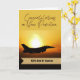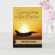 Felicidades por su ascenso a teniente coronel en la Fuerza Aérea. Tarjeta de felicitación de papel con una fotografía de un avión militar de la Fuerza Aérea contra un sol ardiente en el cielo. Agregue un nombre a la cinta con tonos dorados en la portada de la tarjeta. Arte, imagen y verso copyright © Shoaff Ballanger Studios, 2022.