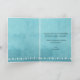 La carta de felicitaciones por el compromiso boda moderno que personalizas con el nombre de las parejas afortunadas. El texto interno dice: ¡Deseándote mucha felicidad en tu viaje juntos! ¡Felicidades por tu compromiso!Aspecto de fondo de color azul acuático. Se incluyen elementos de diseño de corazón y cruza.