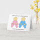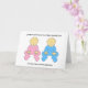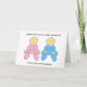 Un simple ilustracion de gemelos (un niño y un chica) sentados uno al lado del otro. Un bebé está usando rosa y el otro está usando azul. La imagen se establece en un fondo blanco y nítido. Las palabras 'Felicitaciones por tu día de los nombres de bebés a dos bebés muy preciados' acompañan la imagen.