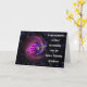 Tarjeta de felicitaciones por su aceptación en la Academia de Formación Espacial. El diseño es una nebulosa lavanda que envuelve una flor de pasión que se parece un barco espacial. El fondo es negro y el cielo está lleno de estrellas. Las palabras en el frente son permanentes, el interior se puede cambiar.